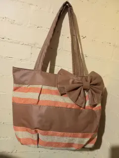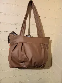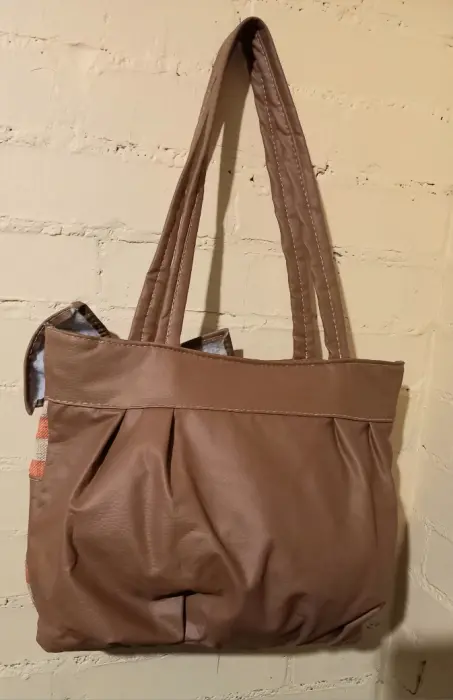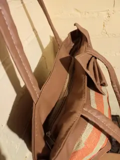 Bolsa de vinipiel y tela acabados en volor café y anaranjado forro de tela
