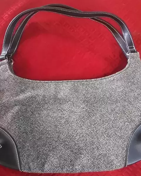 Bolsa de mano en tela como de lana, color gris y negro con vistas en las orillas de vinipiel negro igual que en la asa.