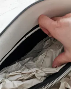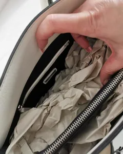Bolsa de mano Nueva. Acabado imitación piel de color blanco. En la parte de atras tiene un bolsillo de jareta con siper. Al interior tiene 2 compartimentos separados por un bolsillo con siper, además en un costado tiene un bolsillo de jareta con siper y en el otro costado 2 bolsillos de parche.