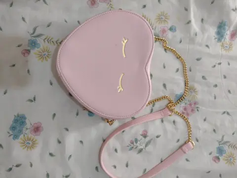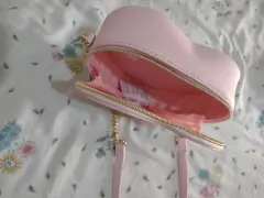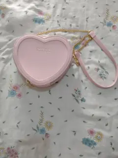 Bolsa de mano color rosa en forma de corazón. Vivos dorados. Con forro Correa con cadena larga.