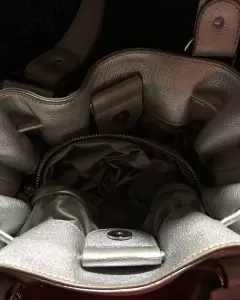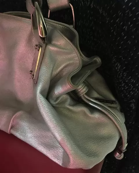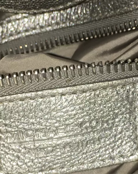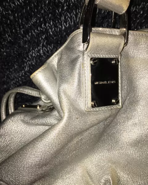 Bolsa de piel plateada Michael Kors, en condiciones de uso normal, 34 cm de largo, 25 cm de ancho