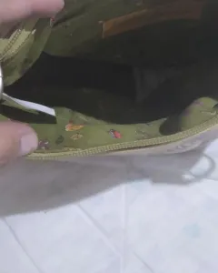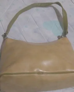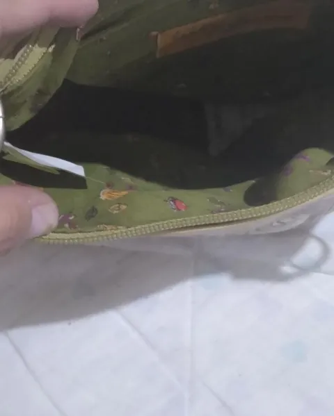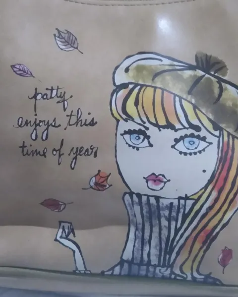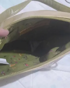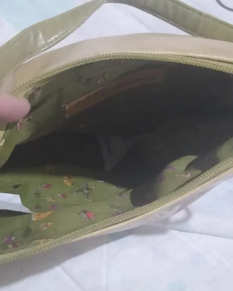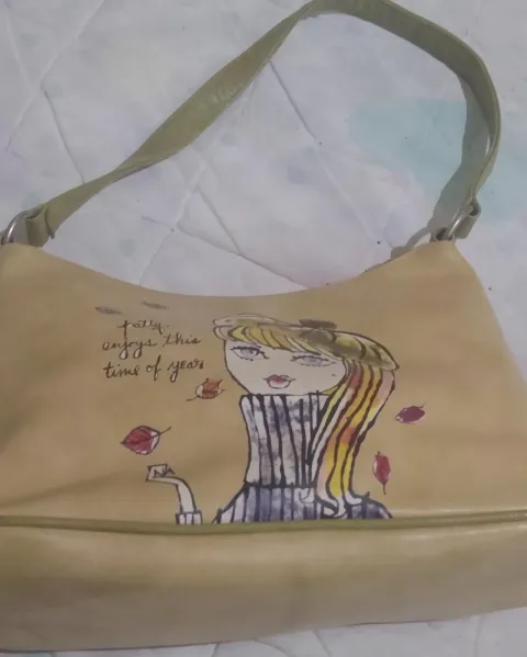 Bolsa tipo plasti piel, el asa, las costuras y el cierre son color verde claro.Tiene al frente el dibujo de una muñequita.Al interior esta forrada con tela de flores y tiene una bolsita con cierre.El asa esta un poco desgastada (ver ultima foto)Medidas 25 x 15 x 10 cms.