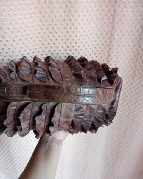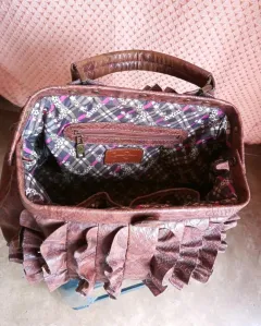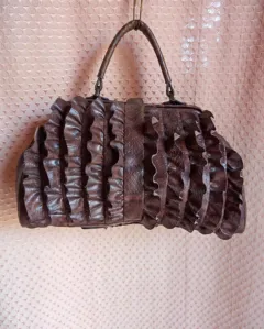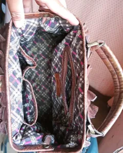 Diseño floral en el interior y diseño de piel de cocodrilo/serpiente en el exterior. Pequeños desgastes de uso. Medidas: 37 cm de ancho y 24cm de alto aproximadamente, sin contar la aza