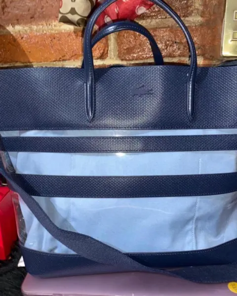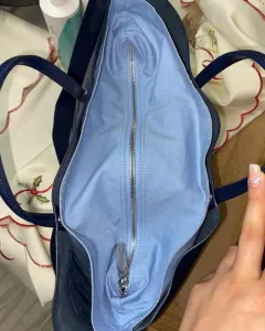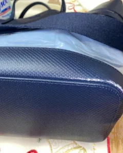 Bolsa Lacoste azul marino con alzas y correa rígidas, la correa mide aproximadamente 20 cm se usó dos veces y solo tiene un poco de raspón en la esquina como se ve en las fotos