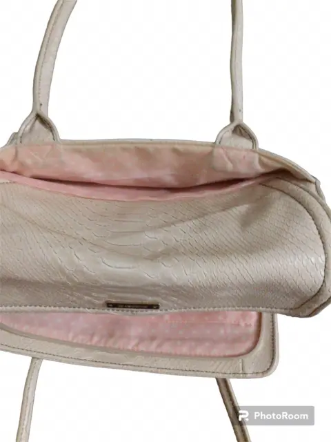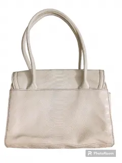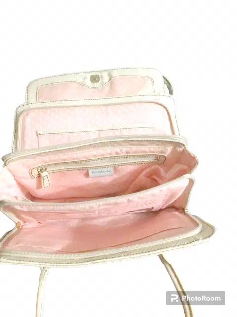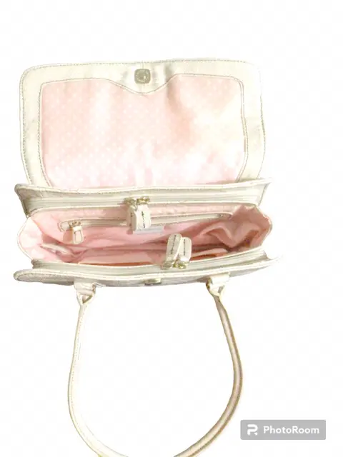 Bolsa Liz Claiborn crema. Bolsa Liz Clairbone color crema o beige claro, tiene mucho espacio de almacenamiento, detalles de una mancha al frente muy tenue y el forro del ultimo compartimento está un poco amarillo