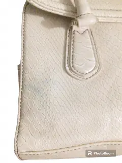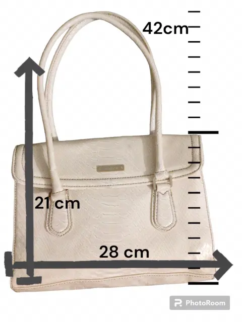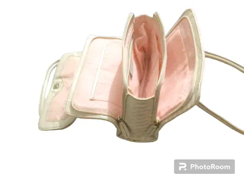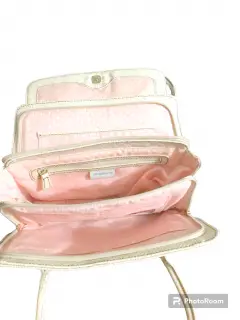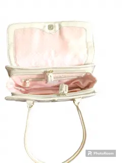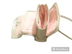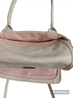 Bolsa Liz Clairbone color crema o beige claro, tiene mucho espacio de almacenamiento, detalles de una mancha al frente muy tenue y el forro del ultimo compartimento está un poco amarillo