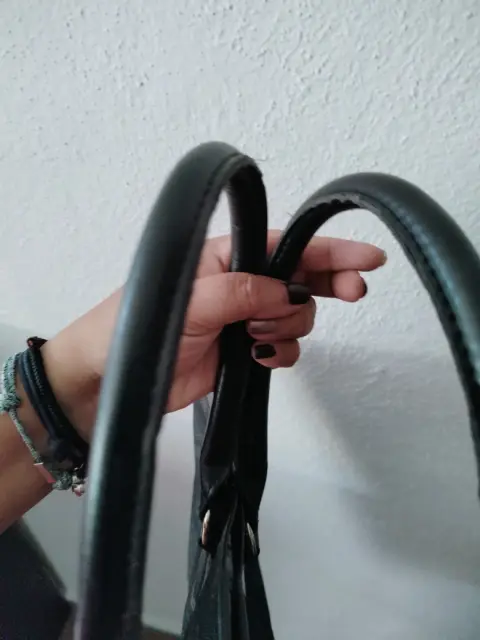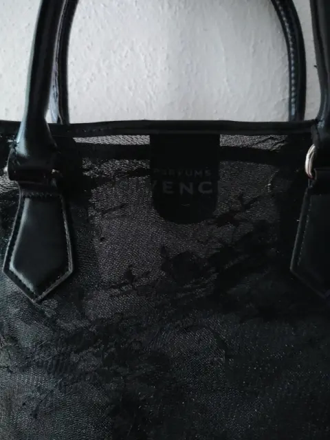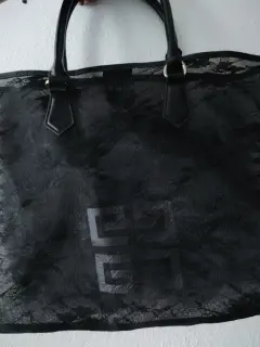 Bolsa Negra de mano Grande. Solo tiene detalles internos en sus asas por estar guardada, esta hecha con una malla que aparenta ser encaje esta nueva prácticamente! Cabe de todo, incluso una Laptop, Medidas, largo desde el asa 49cm sin asa 34 cm y de ancho 42 cm