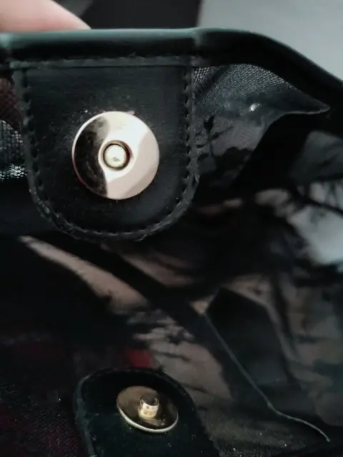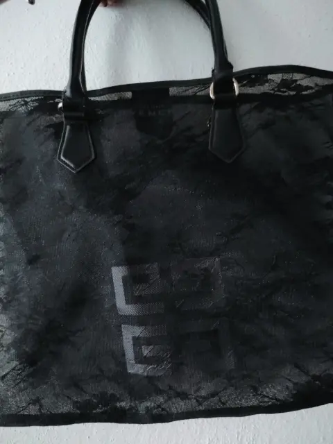 Solo tiene detalles internos en sus asas por estar guardada, esta hecha con una malla que aparenta ser encaje esta nueva prácticamente! Cabe de todo, incluso una Laptop, Medidas, largo desde el asa 49cm sin asa 34 cm y de ancho 42 cm