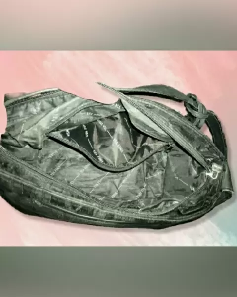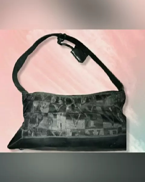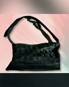 Bolsa negra de piel y tela. Trae correa y cierre. Con un bolso externo que cierra con Velcro. Mide 30x16x10cm. Tiene un mínimo desgaste en la correa, imperceptible. Es de base dura.