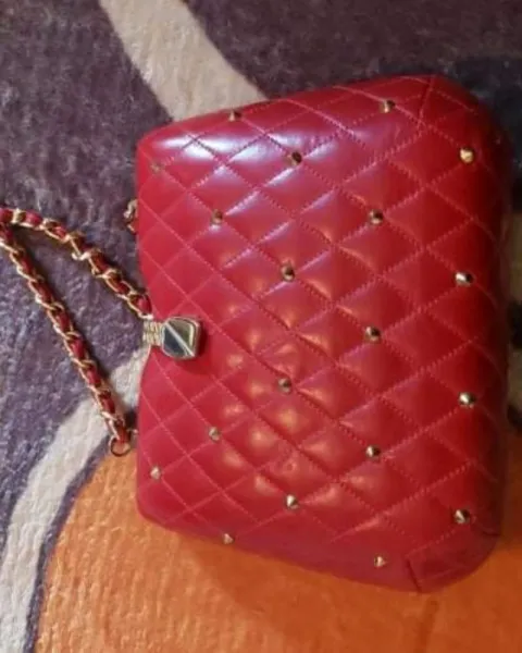 Bolsa rojo estoperol. Hermosa bolsa tono rojo, con estoperoles. Hermosa asa de cadena