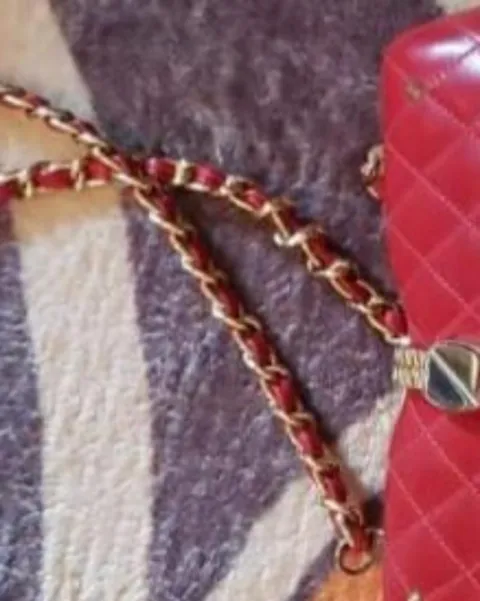 Hermosa bolsa tono rojo, con estoperoles. Hermosa asa de cadena