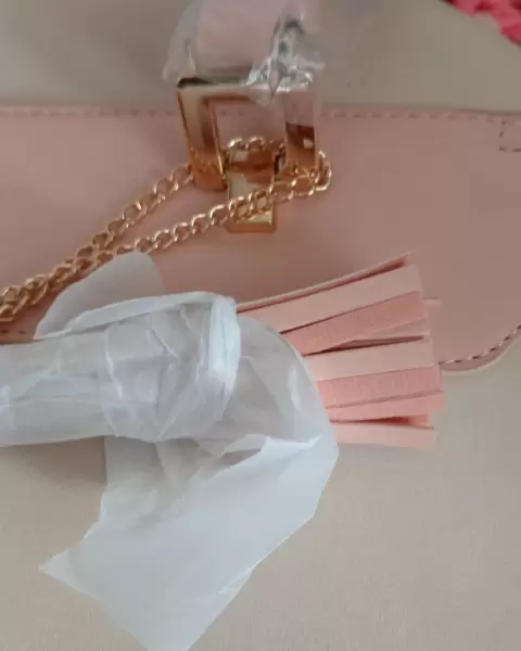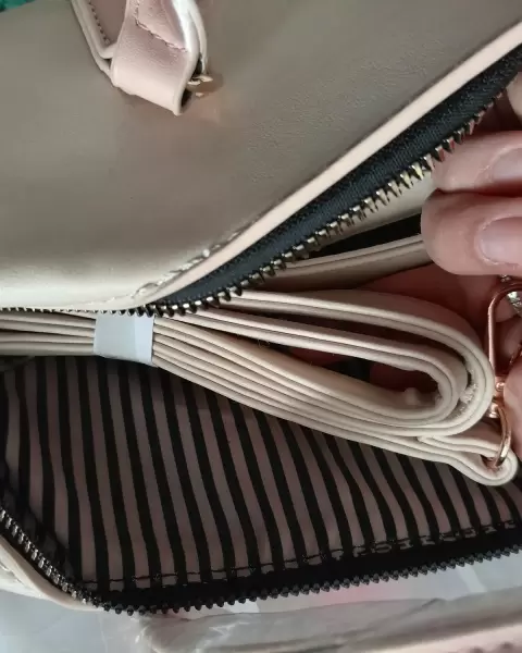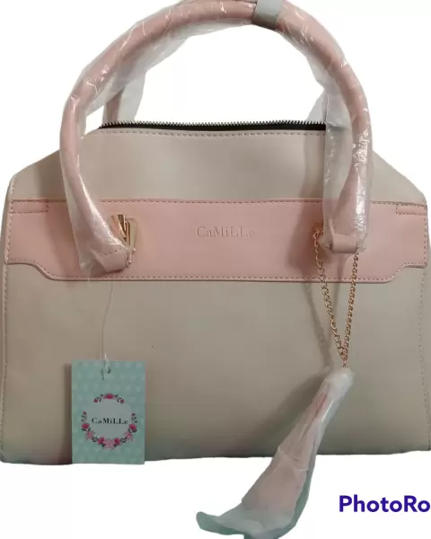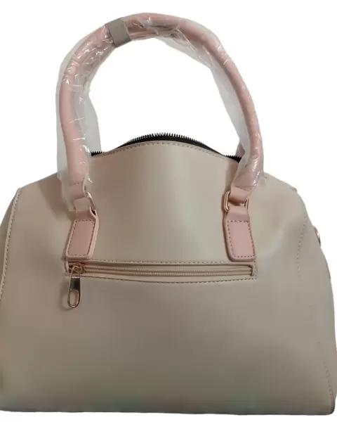 Hermosa bolsa satchel beige con detalles rosas, nueva con etiqueta.