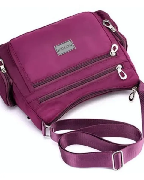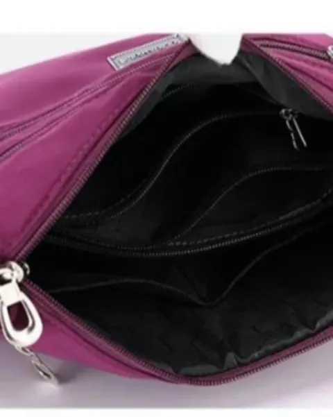 Bolso tipo bandolera, Color violeta, con varias bolsas, material Nailon, 28 cm de larga, ancha 12 cm y alta 20 cm. Puedo bajar un poco el precio ☺️