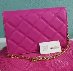 Bolsa sintética tipo sobre, en color rosa con cadena