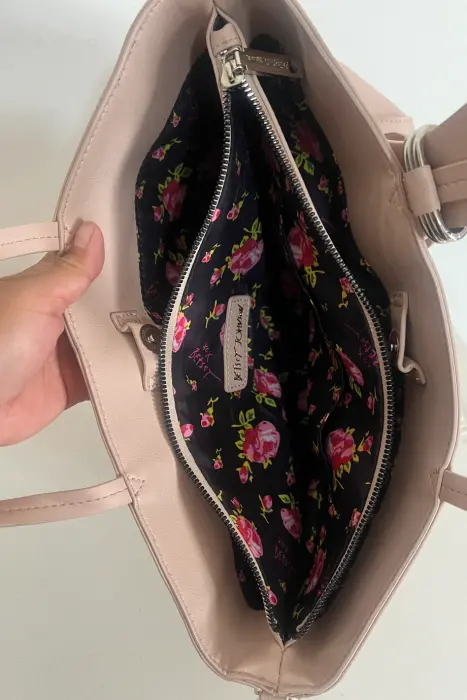 Encantador bolso Betsey Johnson en color nude con detalle de moño. En excelente estado,tiene manchas negras en las asas pero no son tan visibles, perfecto para un look femenino y sofisticado. Espacioso y elegante, ideal para cualquier ocasión. ¡Hazlo tuyo ahora!***Primera imagen referencia de uso.
