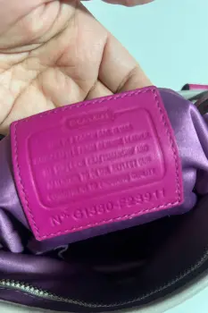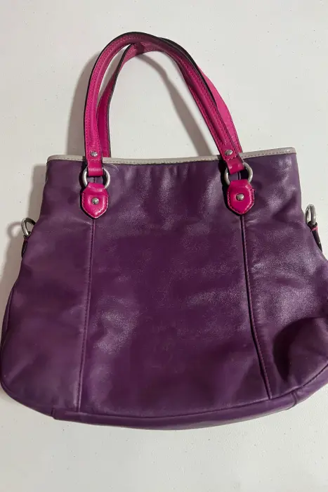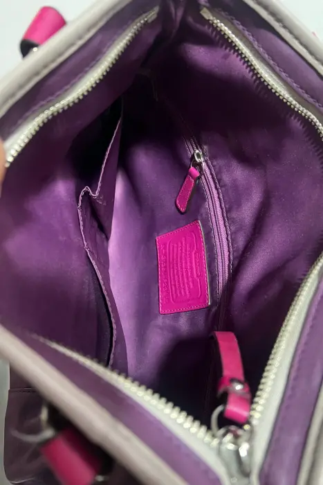 Bolso de mano Coach Daisy Mia de piel con un vivaz tono púrpura y toques de fucsia en sus correas y detalles, irradiando una estética moderna y juvenil. Le falta correa para cruzarla , todos cierres funcionan bien y el forro esta completo sin agujeros.
