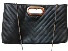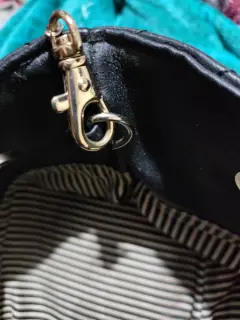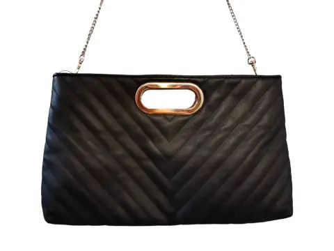 Bolsa negra, ancha, con cadena la cuál se puede quitar, con suficiente espacio para guardar tus cosas, ideal para tus looks formales o casuales.Tambien cuenta con broches en las esquinas del bolso para poder cerrarla.*Tiene desgaste en la parte de la agarradera.