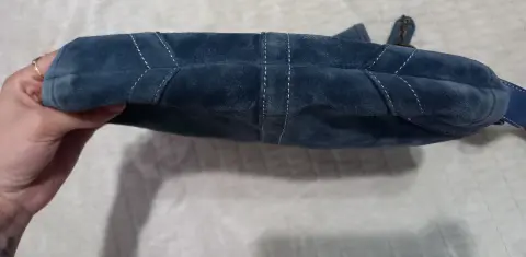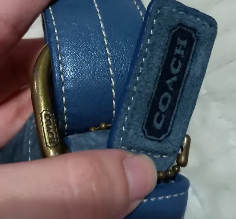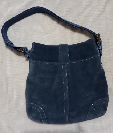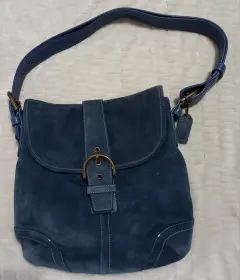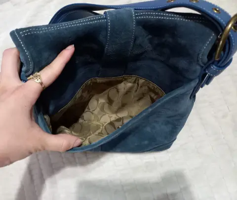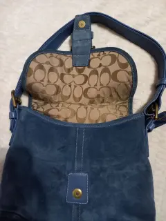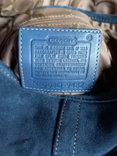 Bolsa coach de gamuza color azul, broches y cierres funcionan correctamente, la asa no esta desgastada ni rota, detalle en ultima foto, se percibe poco a simple vista