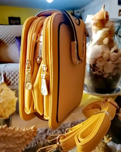 Hermosa bolsa de mano tipo Crossbody en color Mostaza. Con tres compartimientos interiores. Excelente calidad. Ideal para llevar justo lo necesario.