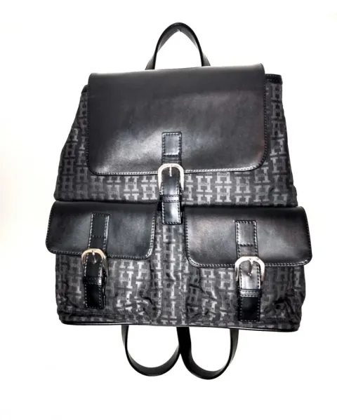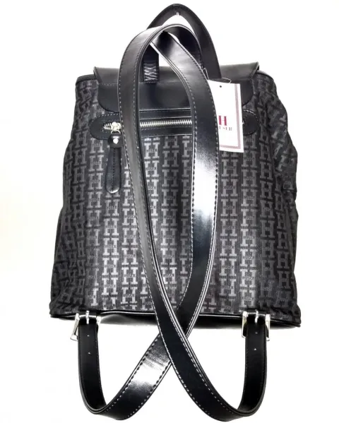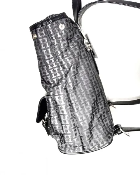 Backpack/mochila color negro diseño monograma de la marca HUSER 100% original completamente nueva con etiqueta. Muy amplia y también expandible por botones laterales de presión. Compartimentos frontales y forro interno de tela. Material tela sintética y semipiel sintética con aplicaciones metálicas color plata