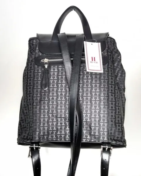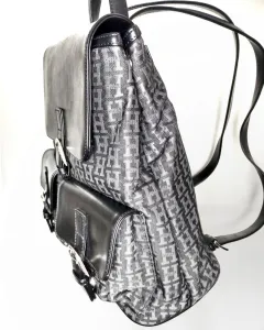 Backpack color negro monograma HUSER. Backpack/mochila color negro diseño monograma de la marca HUSER 100% original completamente nueva con etiqueta. Muy amplia y también expandible por botones laterales de presión. Compartimentos frontales y forro interno de tela. Material tela sintética y semipiel sintética con aplicaciones metálicas color plata