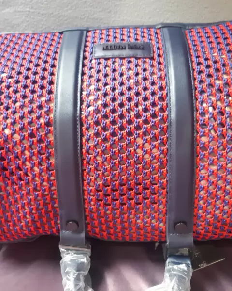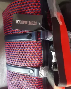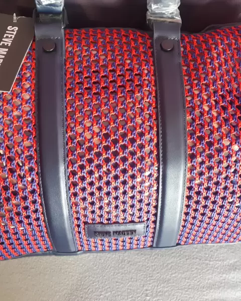 Bolsa Bowling Steven Madden. Bolsa calada Steve Madden, roja y azul, nueva, con cinta para colgar. Mide 36 cm de ancho, 24 cm de alto y 20 cm de profundidad