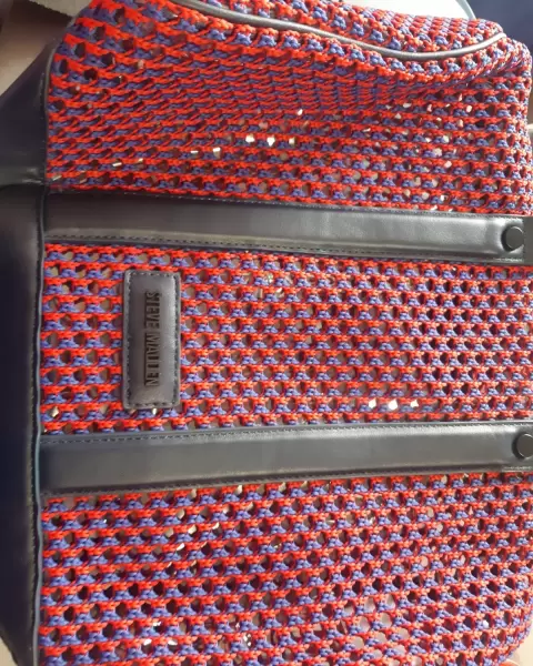 Bolsa calada Steve Madden, roja y azul, nueva, con cinta para colgar. Mide 36 cm de ancho, 24 cm de alto y 20 cm de profundidad