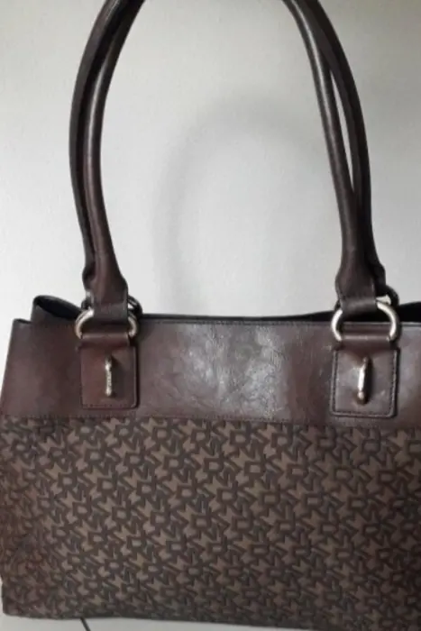 Bolsa cafe DKNY. Bolsa DKNY, color cafe, piel con tela, tamaño grande, viene amplia...envio en caja reciclada