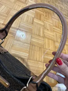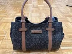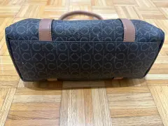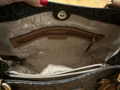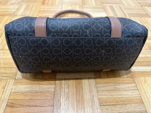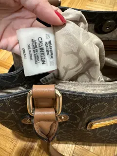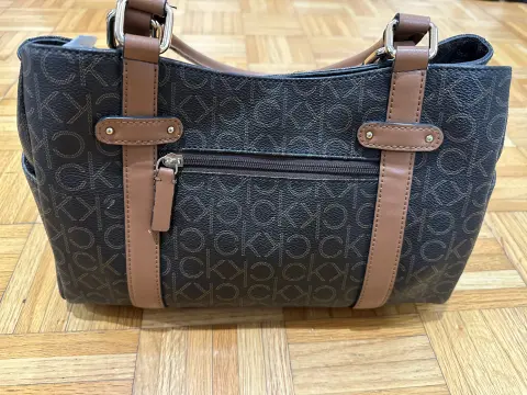 Bolsa con monograma CK, color café con espacio suficiente para tus cosas, es mediana.Trae detalle en una de las asas, se le cayó la goma que cubre la costura, cómo se ve en la foto.De lo demás está como nueva