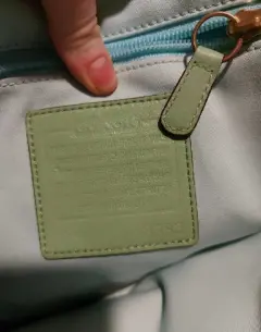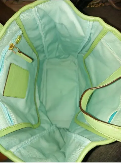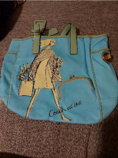 Bolsa Coach. Bolsa Coach En tela color azul claro Asas y detalles en piel verde pistache 2 bolsas a los costados1 pequeño monedero frontal basta ampliaNueva sin etiquetas