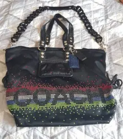 Bolsa Coach Edición Especial. Bolsa Coach Puppy Edicion LimitadaColor negro en satin sin rasgaduras, manchasDetalles en Piedras , le falta 1 en la parte del logo y otra en la trasera no afecta en su uso y casi no se nota .Asas con detalles en charol en buen estadoStrap original de plasticoEl interior necesita lavarse y queda como nuevo (un poco sucioBolsa bastante Amplia