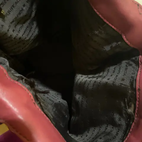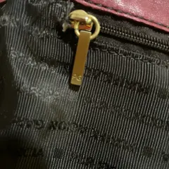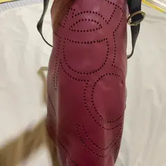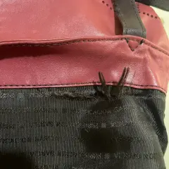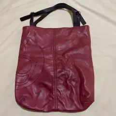 Bolsa de piel color cereza con asa en café. Bolsa de hombro. En buenas condiciones. Con detalle en el forro interior y algunas manches por el uso. La piel es súper suavecita. Mide 40 cm x 35 cm.