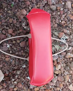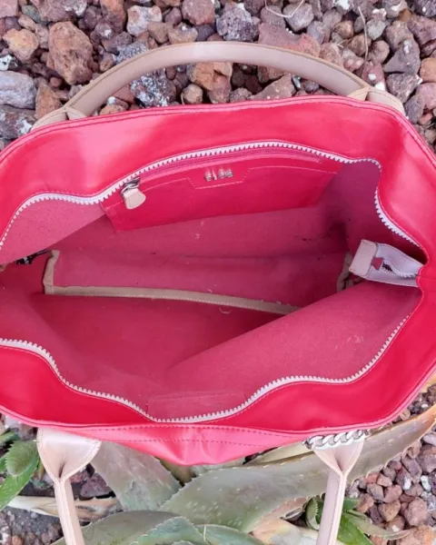 Bolsa color rojo con asas en color beige.Placa metálica de la marca en plata.Ligero desgaste del material exterior.Forro 100% textilExterior 100% sintéticoMedidas 32 de largo * 31 de ancho