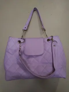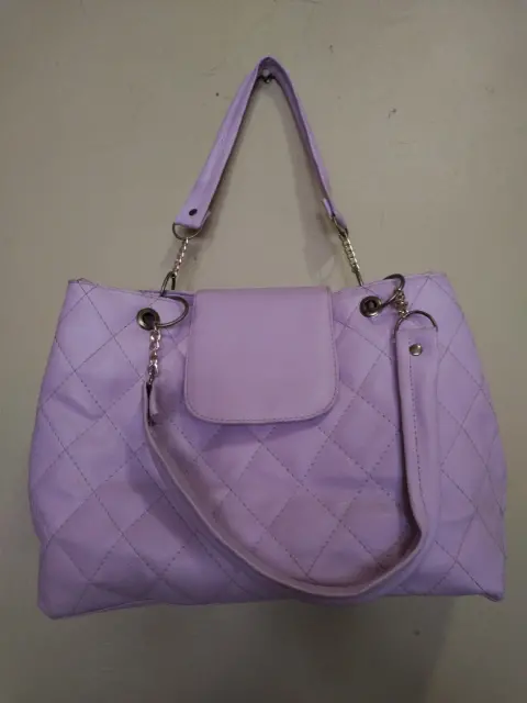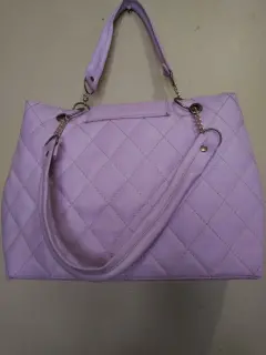 Bolsa grande color lila con cadena, a parte trae para colgarse o si sólo la quieres usar así...muy elegante.