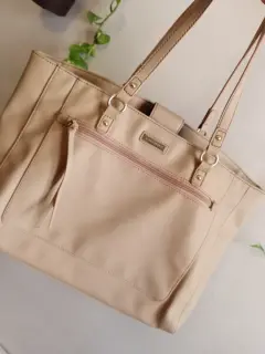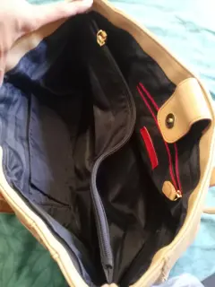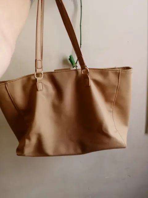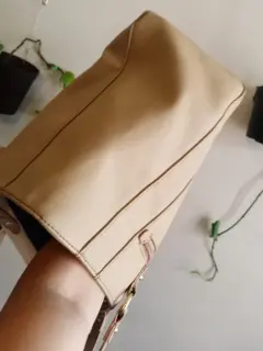 Bonita bolsa TH grande color beige mide 40 CM de ancho x 30cm de alto y 15 CM de ancho lateral le cabe bastante no tiene ningún detalle ni rotura solo el desgaste que se ve en las fotos tal cual 💞