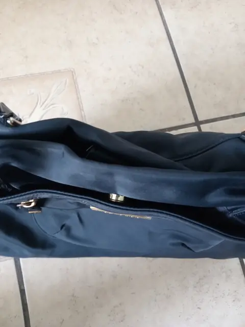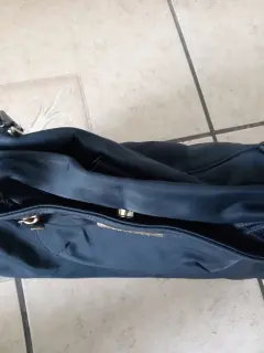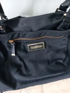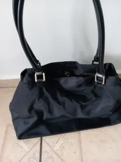 Bolsa moderna de tela. Tela gruesa, con varios compartimentos, doble asa para colgar en los hombros.