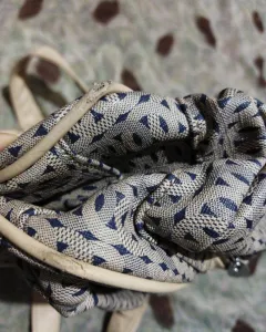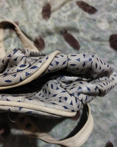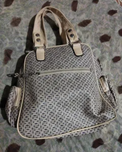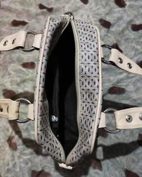 Bonita bolsa, piel sintética, beige con azul, con diseño en círculos. Tiene detalles en lad esquinas (se aprecia en imagen 4 y 5). Ya no tiene su correa larga, todos los cierres en buen estado.