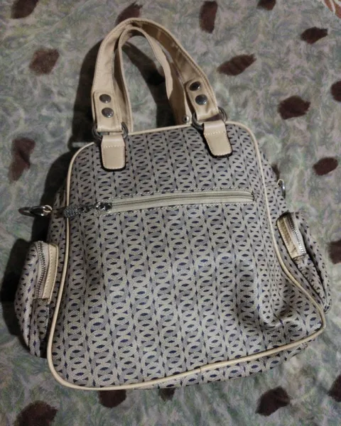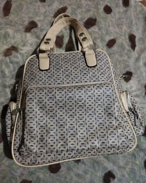 Bolsa muy amplía beige con azul!!. Bonita bolsa, piel sintética, beige con azul, con diseño en círculos. Tiene detalles en lad esquinas (se aprecia en imagen 4 y 5). Ya no tiene su correa larga, todos los cierres en buen estado.
