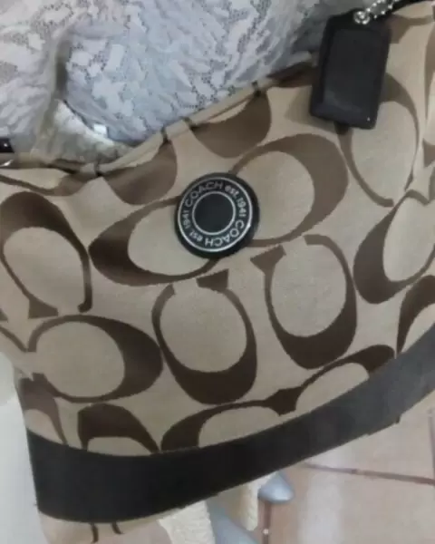 Bolso "Coach" beige/café. Bolso "Coach" de tela, en color beige con café, 27 cm de alto y 32 de largo.