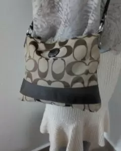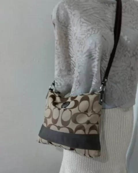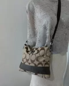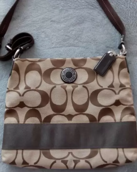 Bolso "Coach" de tela, en color beige con café, 27 cm de alto y 32 de largo.