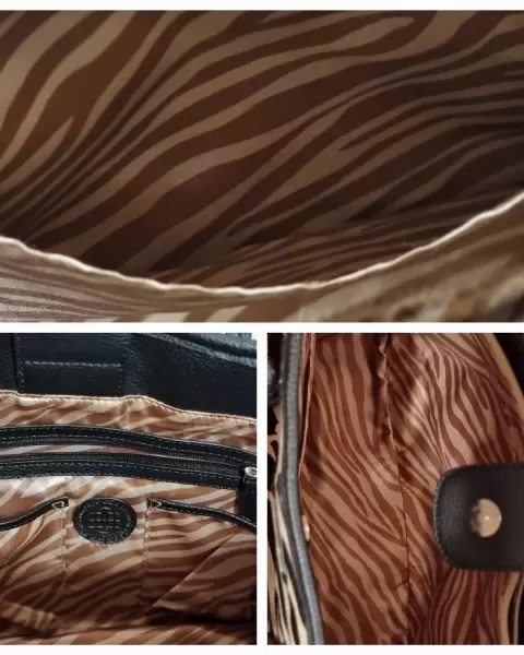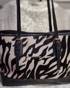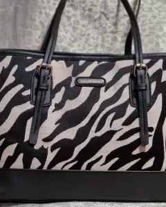 Bolso tipo tote, fabricado en PVC y textil en un diseño animal print muy elegante.Tiene división que permite contar con 2 espacios amplios, c/u de ellos con compartimentos propios.El bolso es nuevo, como se observa en las imágenes.Mide 32 cms. de ancho, 23 de alto y 15 de ancho.