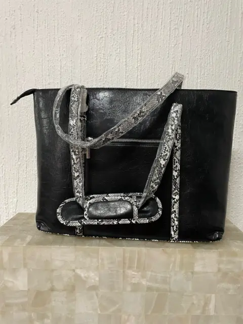 Bolsa Nicole Lee color negro con detalles en piel sintética de pitón. Muy amplia, cuenta con compartimento para laptop y cargador USB. Súper elegante y práctica.