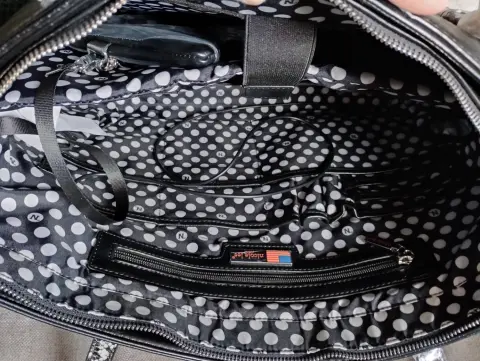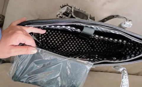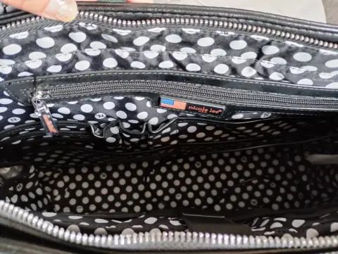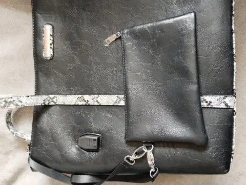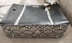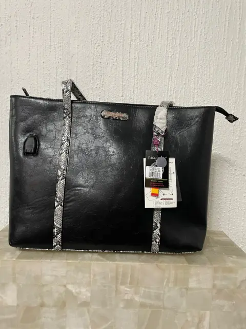 Extraordinaria bolsa para laptop. Bolsa Nicole Lee color negro con detalles en piel sintética de pitón. Muy amplia, cuenta con compartimento para laptop y cargador USB. Súper elegante y práctica.