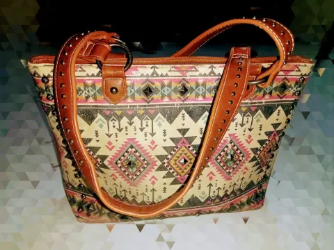 Montana west bag. Hermosa bolsa con remachesy tachuelas muy práctica en tonos rosados y patrón azteca. Tal yal las fotos, ligeros detalles de desgaste.