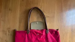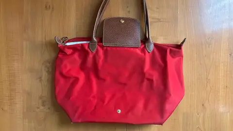 Tote Longchamp grande roja. Auténtica Tote « Le Pliage » Original roja de nylon tamaño grande, cierre y broche de presión dorados perfecta para usarse en un viaje porque le cabe mil!! Tiene dos esquinas desgastadas por el uso, solo hace falta un poco de limpieza.