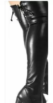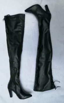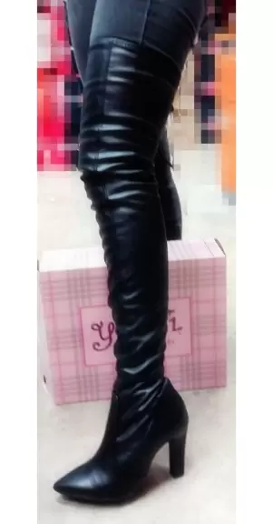 Hermosa bota de invierno Larga alta arriba de la rodilla material vinipiel negra material Strech ajustable.Número Mexicano #24cm.Tiene pequeño cierre, del lateral interno, para que sea fácil de poner. Tacón mide10cm y tubo mide 65cm por lo tanto de arriba al suelo 75cm. Código de descuento en tu primera compra: lucyrmxXqQJ9