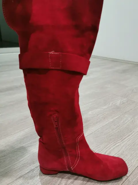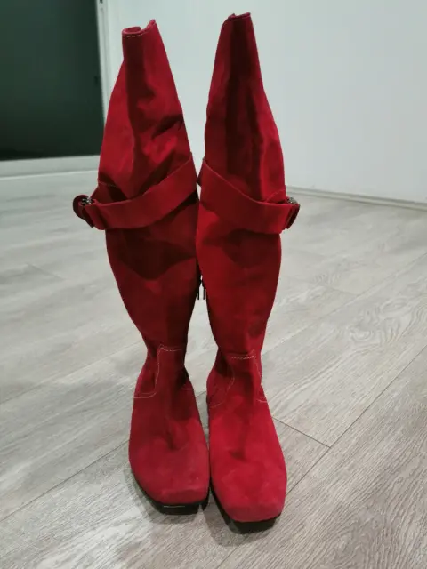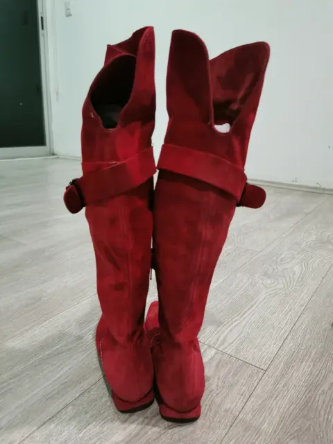 Bota alta. Bota de gamuza color rojo en número 5 con cierre en lateral y hebilla al lado contrario de la marca PRADA