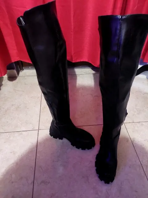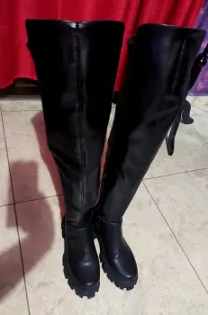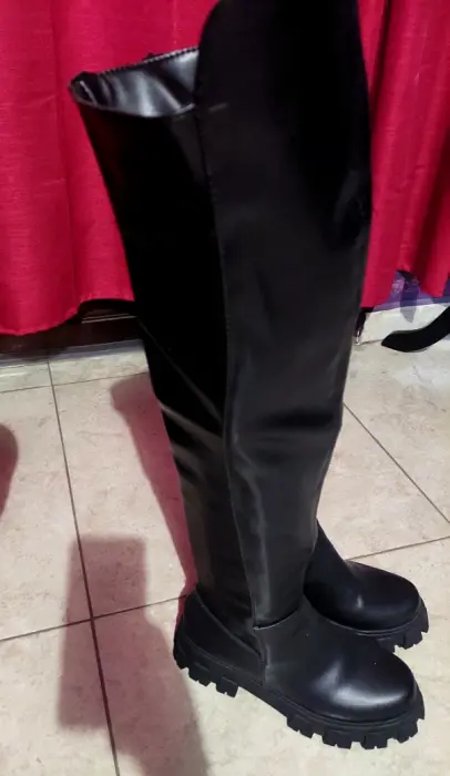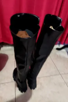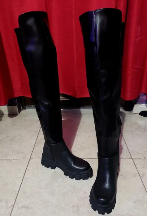 Bota arriba de la rodilla. Botas altas, talla 6 México, sólo una puesta, son muy comodas, y estira el vinipiel se acomoda a la pierna. Plataforma no muy alta, no sé que marca sean. Ultima foto es de referencia.