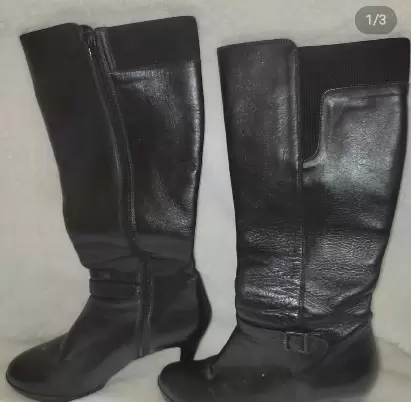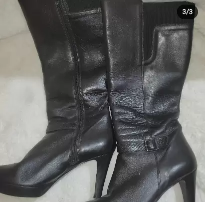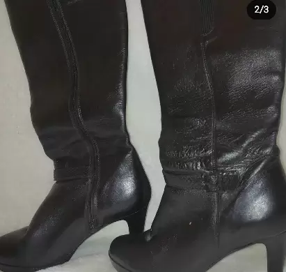 Bota largas color negro 👢. Tacón bajo.❤️Elaborada con material sintetico.💕Super Cómodas.🥴Son semi nuevas, están en muy buen estado Talla 23 1/2