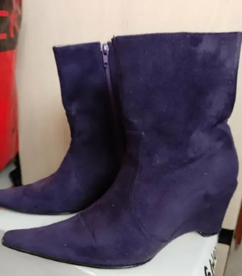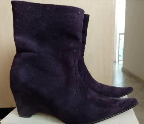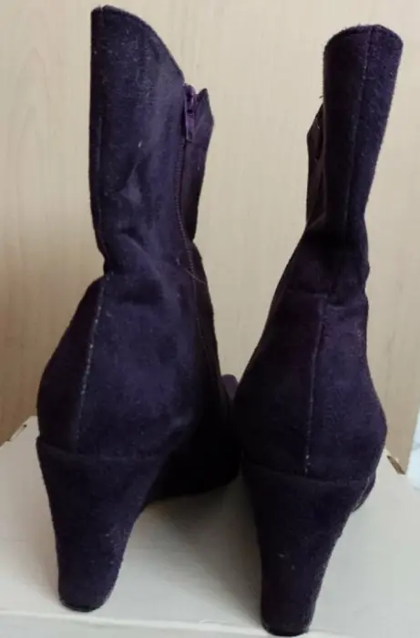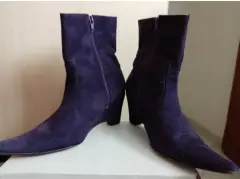 Bota de color morada, tipo gamuza. La punta es en poco. El tacón mide 7cm. Tiene cierre en la parte de adentro. Se encuentra en muy buenas condiciones